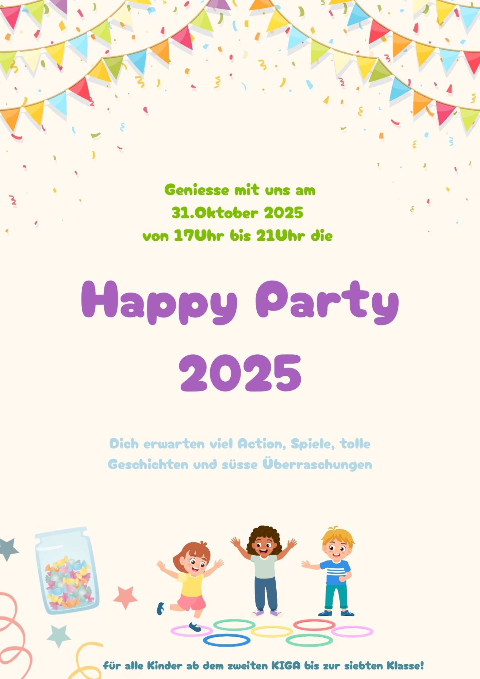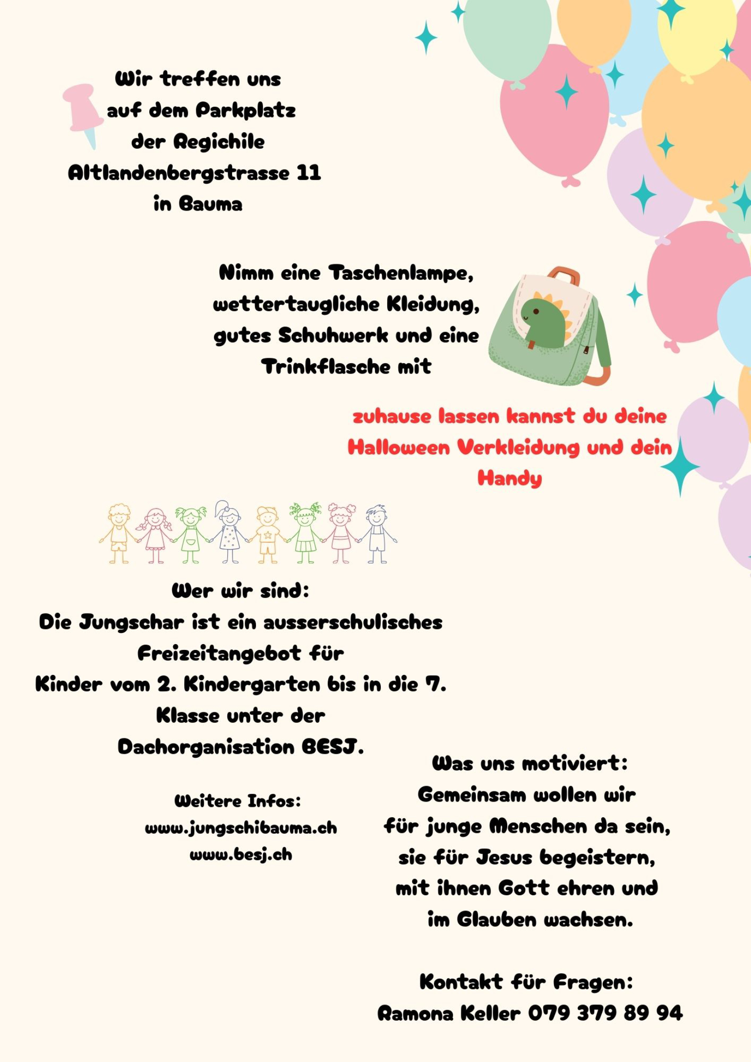 Am 31. Oktober wird an vielen Orten Halloween gefeiert. Wir bieten den Kindern ein Alternativprogramm an. Gemeinsam wollen wir spielen, singen, lachen, ein Abenteuer erleben, eine spannende Geschichte hören, mehr über Gott lernen und natürlich auch naschen. Bringe deine Freunde und dem wetterangepasste Kleidung, die schmutzig werden darf, mit. Ziehe bitte keine Halloween-Verkleidung an. Das ganze findet am 31.10.2025 von 17:00 bis 21:00Uhr in der Regichile an der Altlandenbergstrasse 11 statt.