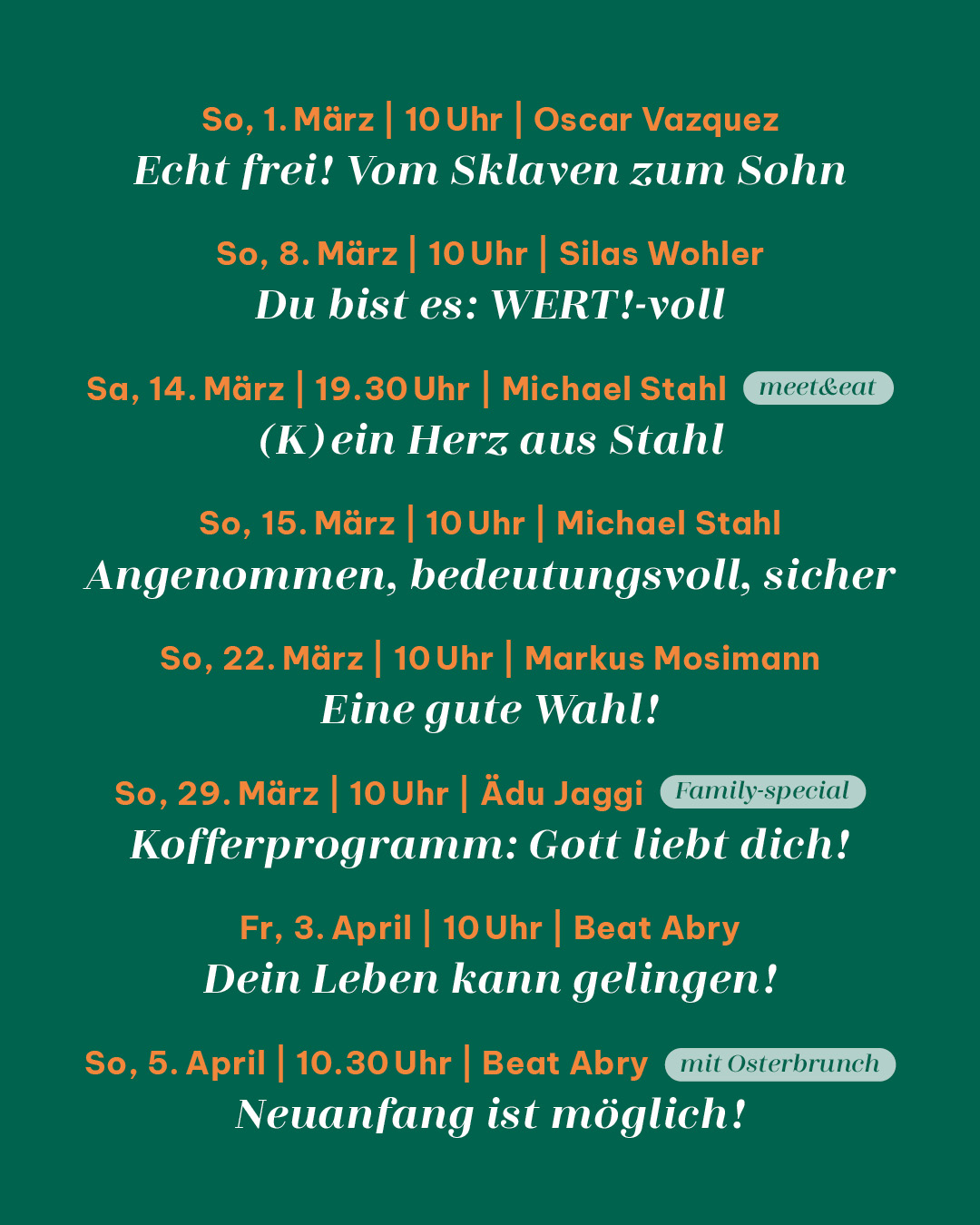 * Am Ostersonntag bist du ab 09:00-10:00Uhr zu unserem Oster-z’Morge herzlich eingeladen. Es erwartet dich ein reichhaltiges Buffet und du hast genug Zeit um anzukommen, bevor du ab 10:30 die hoffnungsvollste Botschaft zu hören bekommst.